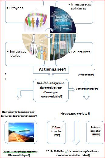 Un groupe de citoyens crée une société de production d’énergie renouvelable en SAS (société simplifiée par actions) et investit au capital de celle-ci. L’action est fixée à 50 €, une personne = une voix. Nous aurons tous accès à la gouvernance de la société. les entreprises et les collectivités peuvent aussi participer. L’enjeu ici est bien de maîtriser les décisions du projet depuis sa conception jusqu’à son exploitation.