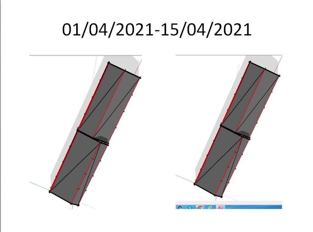 Pour optimiser notre installation malgré ces ombres, nous avons relevé le 1er et le 15 de chaque mois grâce au logiciel Sketchup l’ombre portée au coucher du soleil et l’heure de début de l’ombre, soit 30 mesures. Ensuite, nous avons analysé l’amplitude de ces données à une période (fin de journée) où l’installation photovoltaïque ne donne plus que 15 % de sa puissance.